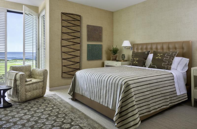 Stripping out the outmoded finishes, Stephan created an interior with a mellow beachfront vibe using white oak for paneling and cabinetry flowing from the living room into the kitchen, and pale raffia wallpaper in the bedrooms. The driftwood-colored palette shared by all the spaces increased and expanded visually expanded limited space. Additionally, by installing hardwood floors, seagrass rugs, leather chairs, and indoor/outdoor fabric, the space was made to feel more accessible and less precious.