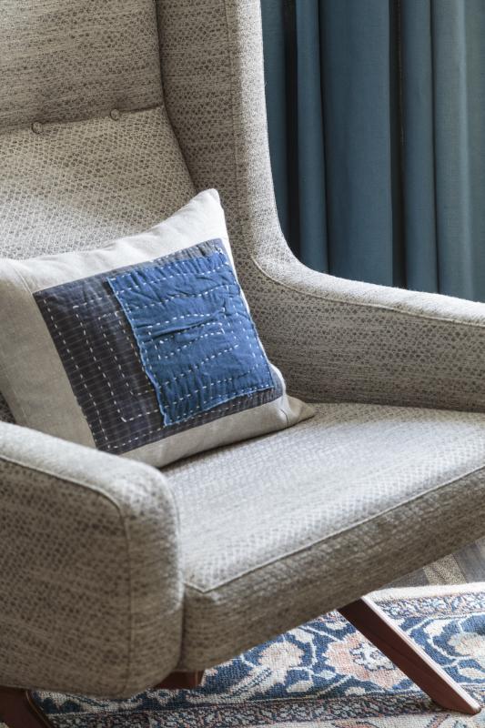 As the basis of the palette for the room Stephan utilized a fabric from an up and coming fabric house, Zak + Fox, a striking antique Sultanabad rug from J.Iloulian Rugs and raked plaster wallcovering from Kneedler-Fauchere. The fabric which featured a complicated traditional print, was rendered in a contemporary striking chocolate brown, ivory and indigo blue for the banquette.