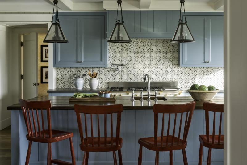 Staying true to the original primary color palette, Stephan employed a subdued but clear blue paint color on the kitchen cabinetry and accented this with barn red on the coutner stools and accents of yellow.
