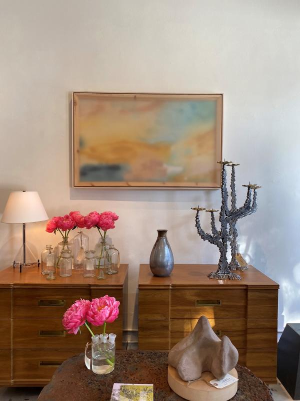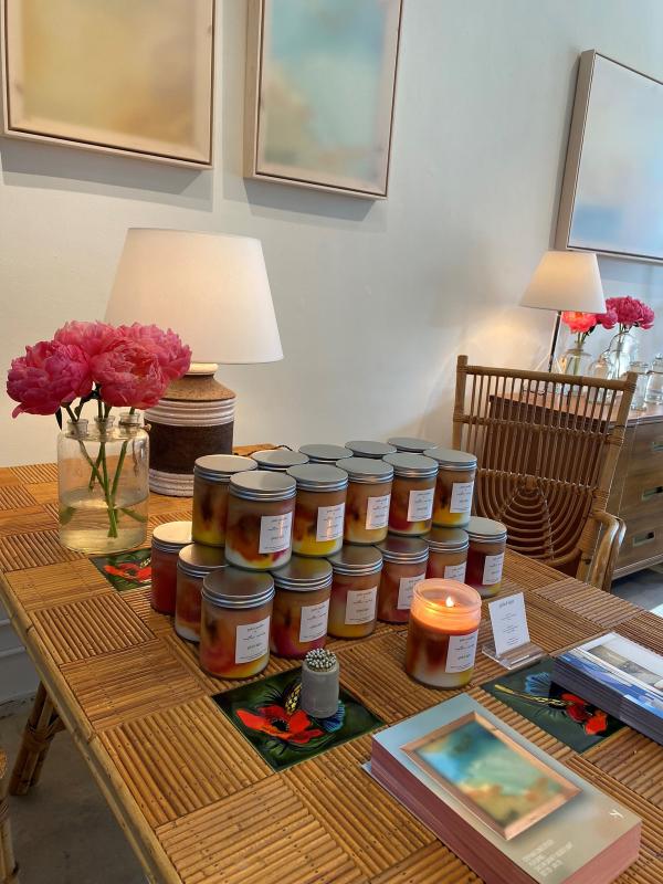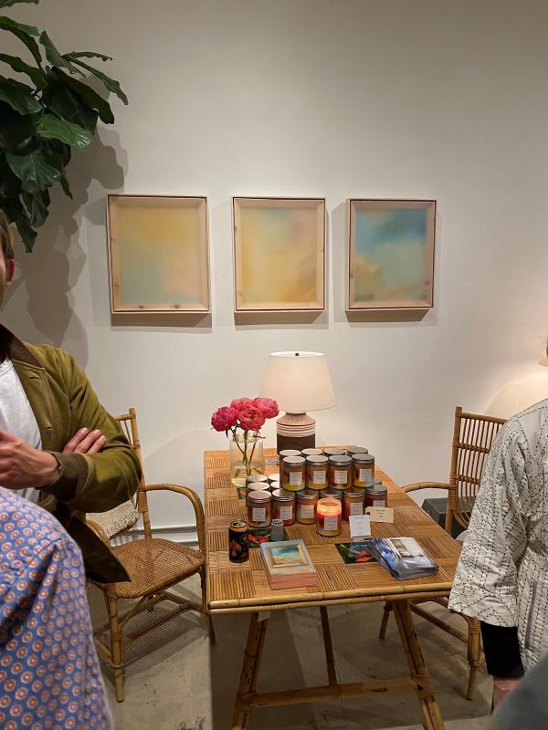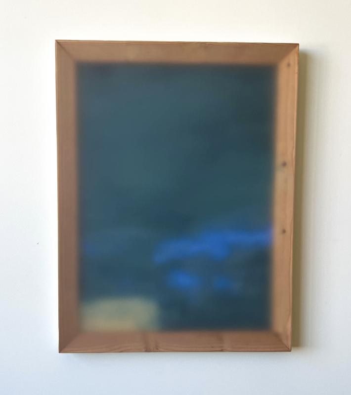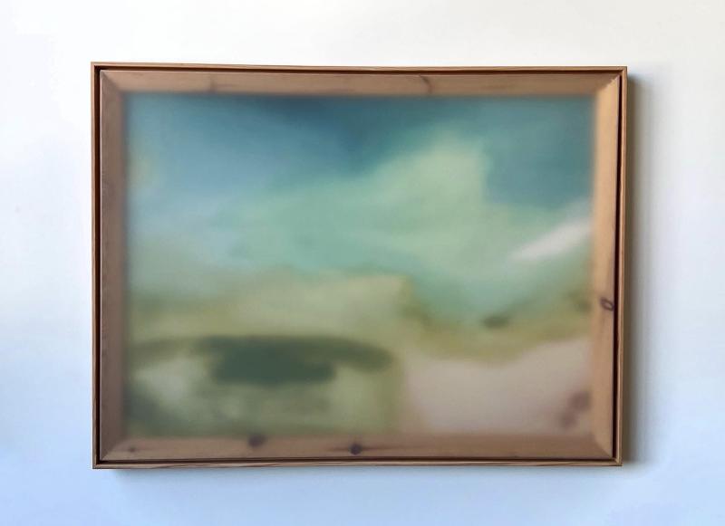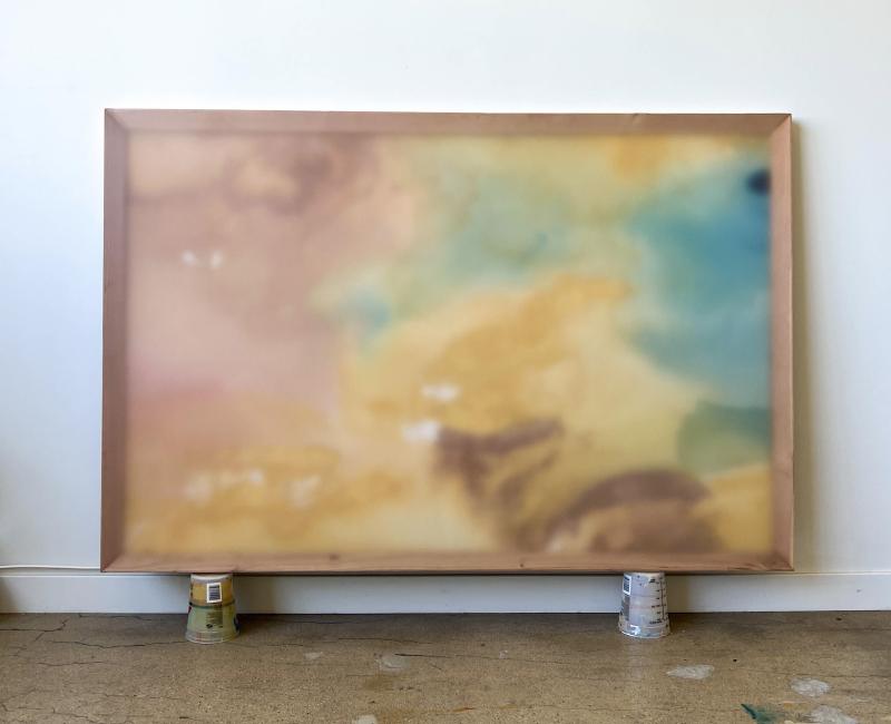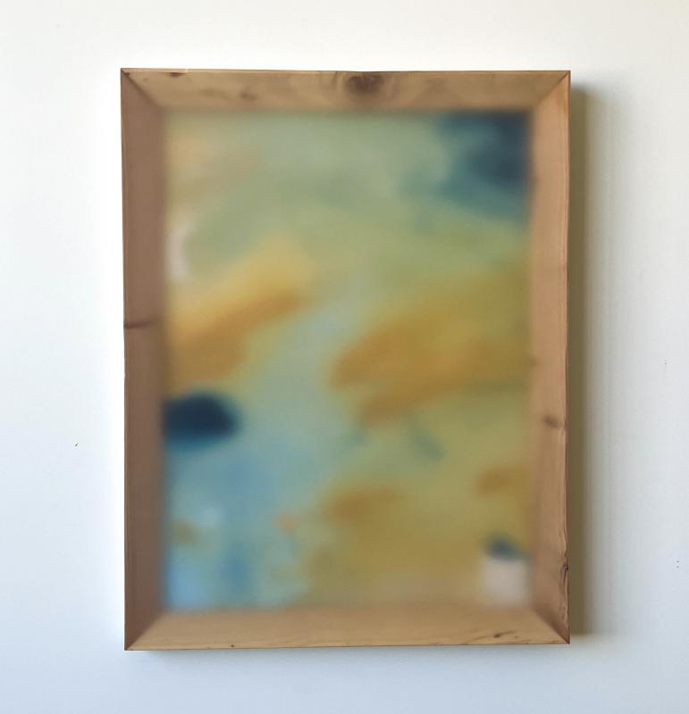 The vivid qualities of the paint and color on canvas are physically screened by an opaque membrane in order to sieve meaning from the hues. These hazy abstractions simultaneously offer visual shelter and confusion, as viewers move far away, close up, and to each side of the works, to experience an illusion of shifting illuminations. Caitlin’s process includes experimenting with her own senses, painting and observing with and without her glasses on, and, in doing so, surrendering herself to an emotive experience of her environment. Through the blurriness, her paintings elicit a connection between color and memory that is both romantic and meditative.