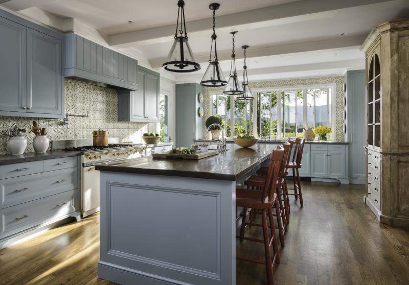 Staying true to the original primary color palette, Stephan employed a subdued but clear blue paint color on the kitchen cabinetry and accented this with barn red on the coutner stools and accents of yellow.