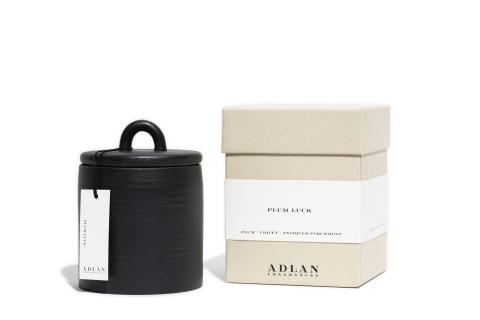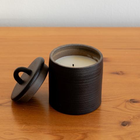 Hand poured coconut wax candle in a lidded graphite stoneware vessel, 290 grams. Scent Notes: Plum, violet, and antiqued parchment.