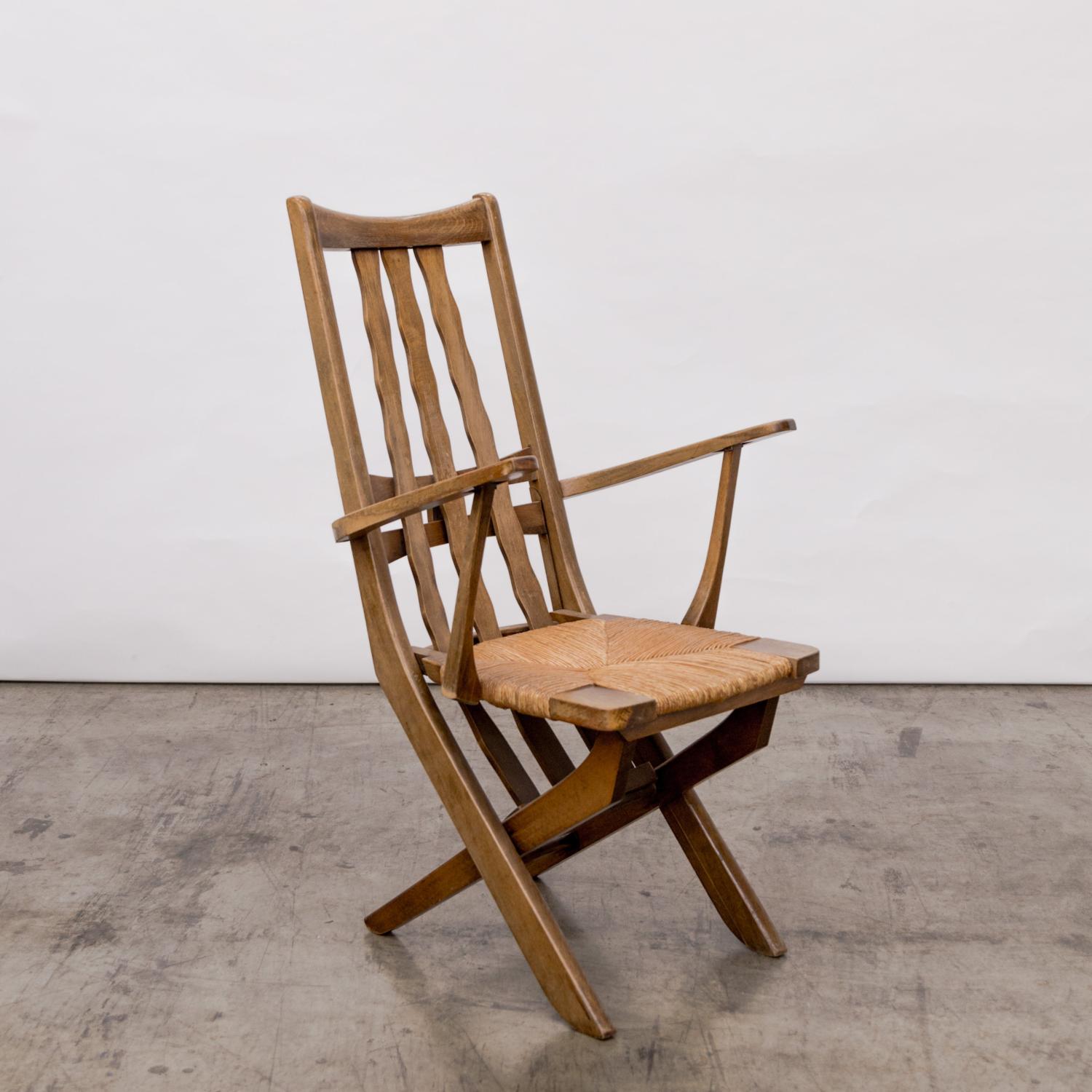 Brutalist pair of oak slat high back adjustable armchairs with rush seats, France circa 1950's.Dimensions: 22.5"w x 20"d x 40.5"oah