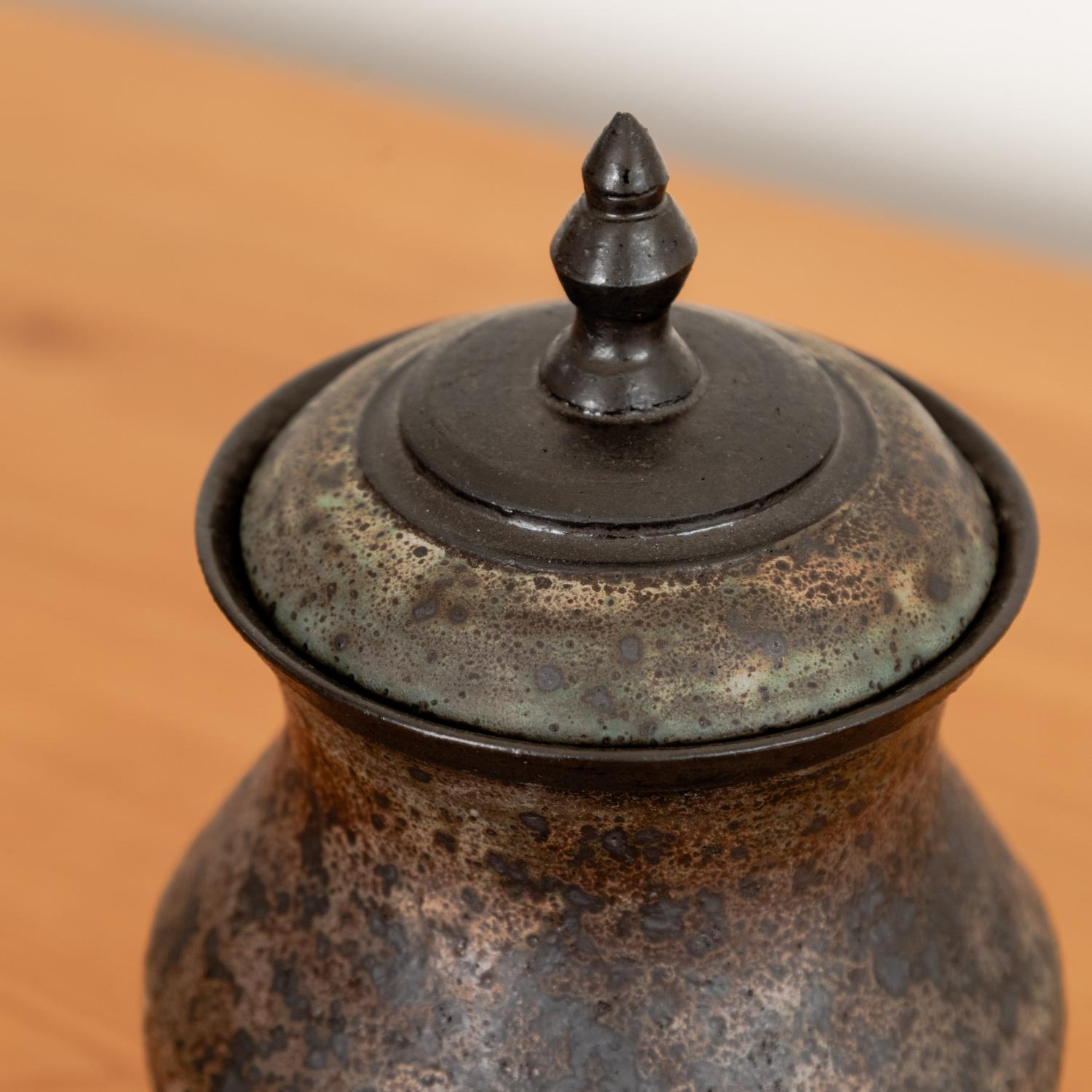 Hand thrown stoneware vessel with lid by Los Angeles artist, Lukas Weyandt. Dimensions: 5"dia. x 8"h
