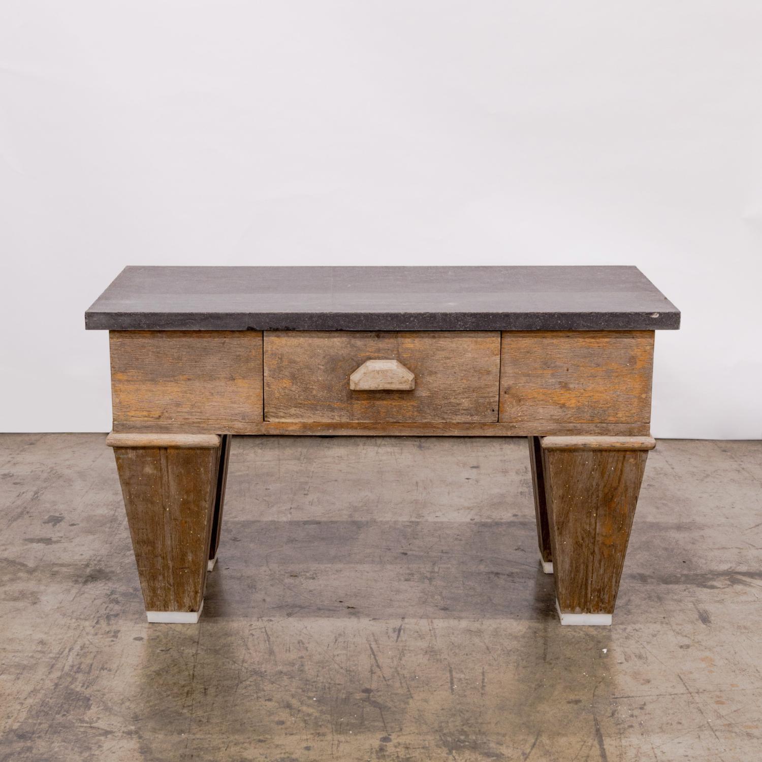 Tough and sturdy worktable with patinated finish, Belgian blue limestone top, chunky tapered legs, and single drawer, France circa 1940's.Dimensions: 49.5"w x 23.25"d x 29.25"h; Slab: 1.5"h
