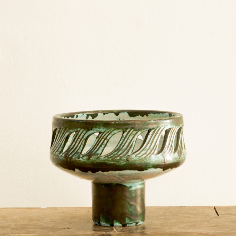 Handcrafted vessel lamp in bottle green glaze and pale celadon glazed interior, newly wired, France circa 1960's.
