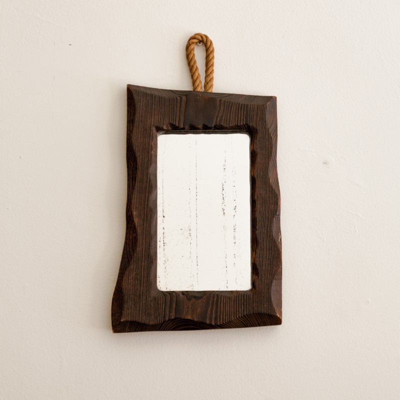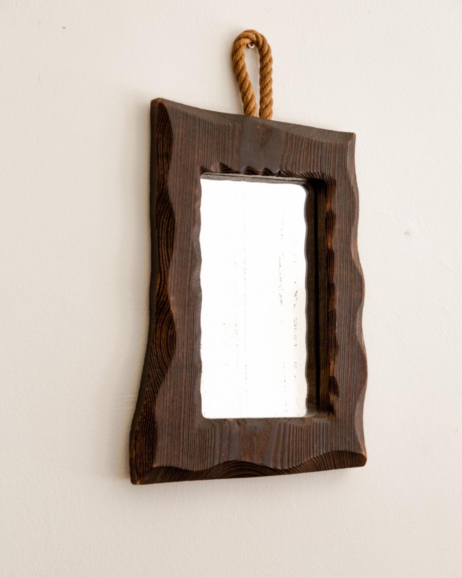 Baltic pine framed brutalist mirror with hemp rope hanging loop, France circa 1960.