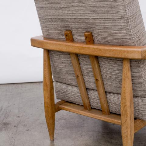 Mid-century oak wood frame Dagobert lounge chair, newly upholstered with button tufted back.