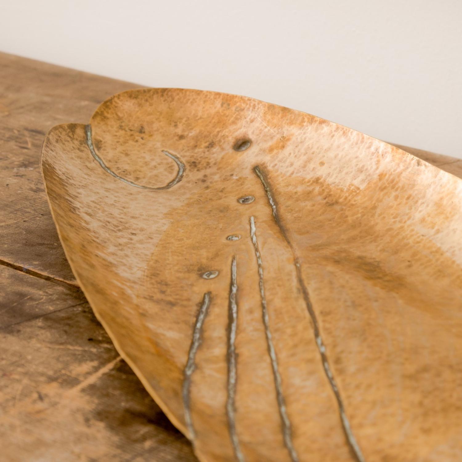 Mid-century hammered brass oblong platter, signed M. Kupfermen 1955.