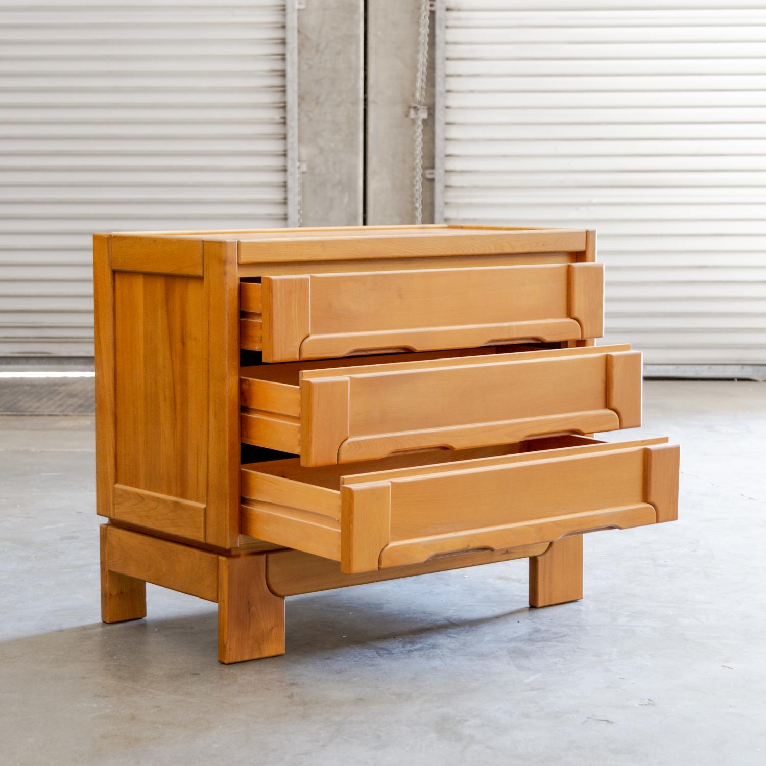 Elm wood three-drawer chest by Maison Regain with expressed joining details and carved integral drawer pulls, circa 1970's France.