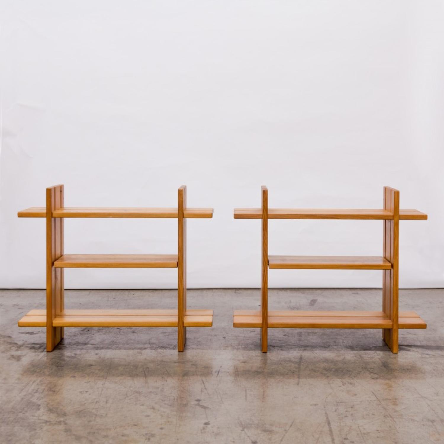 Pair of three tiered elm wood etageres with cantilevered shelf detail and adjustable middle shelf by Maison Regain, France circa 1970's.