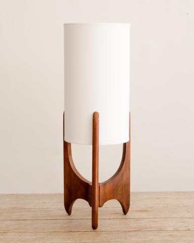 Retro American table lamp with walnut base and cylindrical artisan paper shade with whip stitching, circa 1960's.