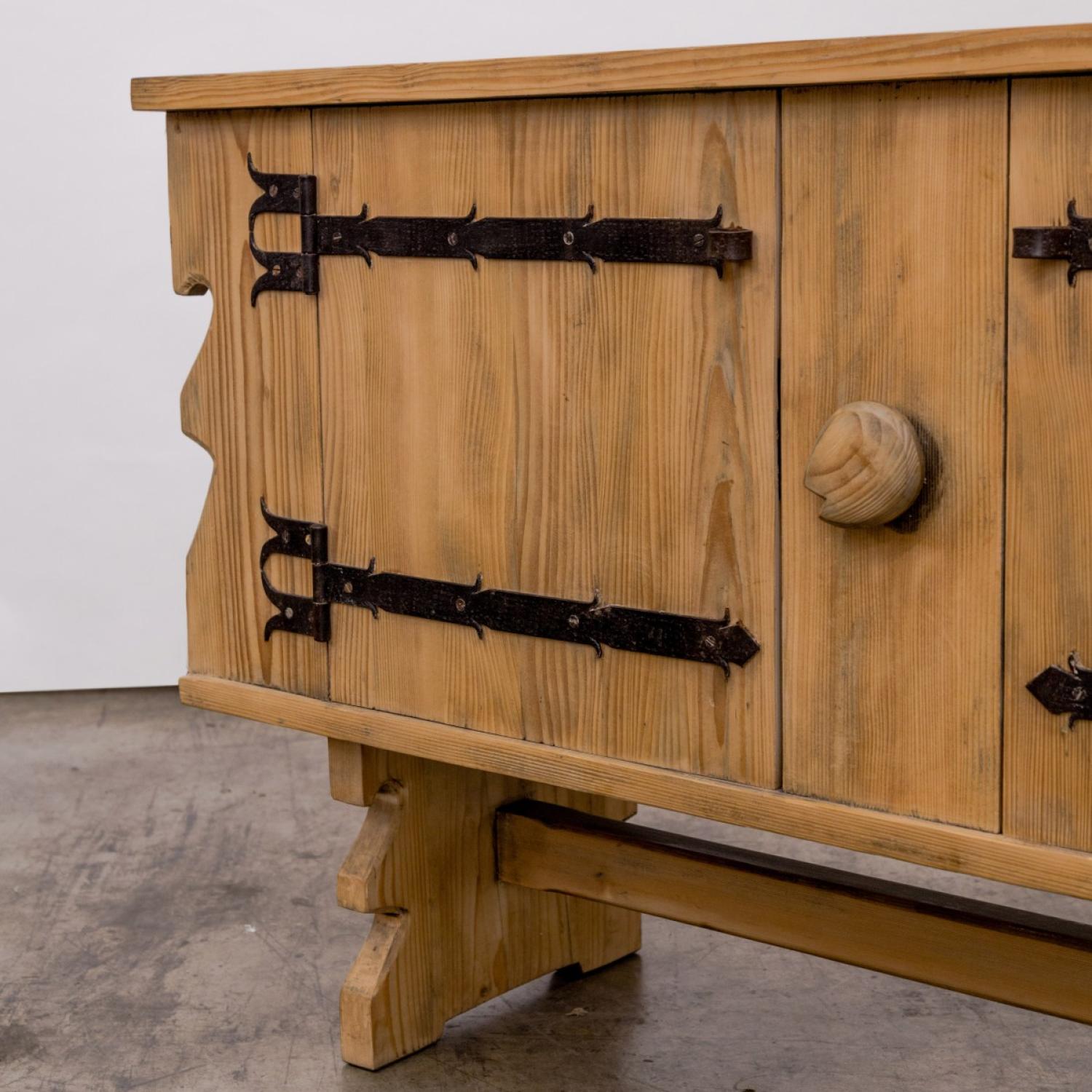 Rustic modern bleached pine cabinet with turn-lock handle and metal bracket strap hinge details, France circa 1960's.