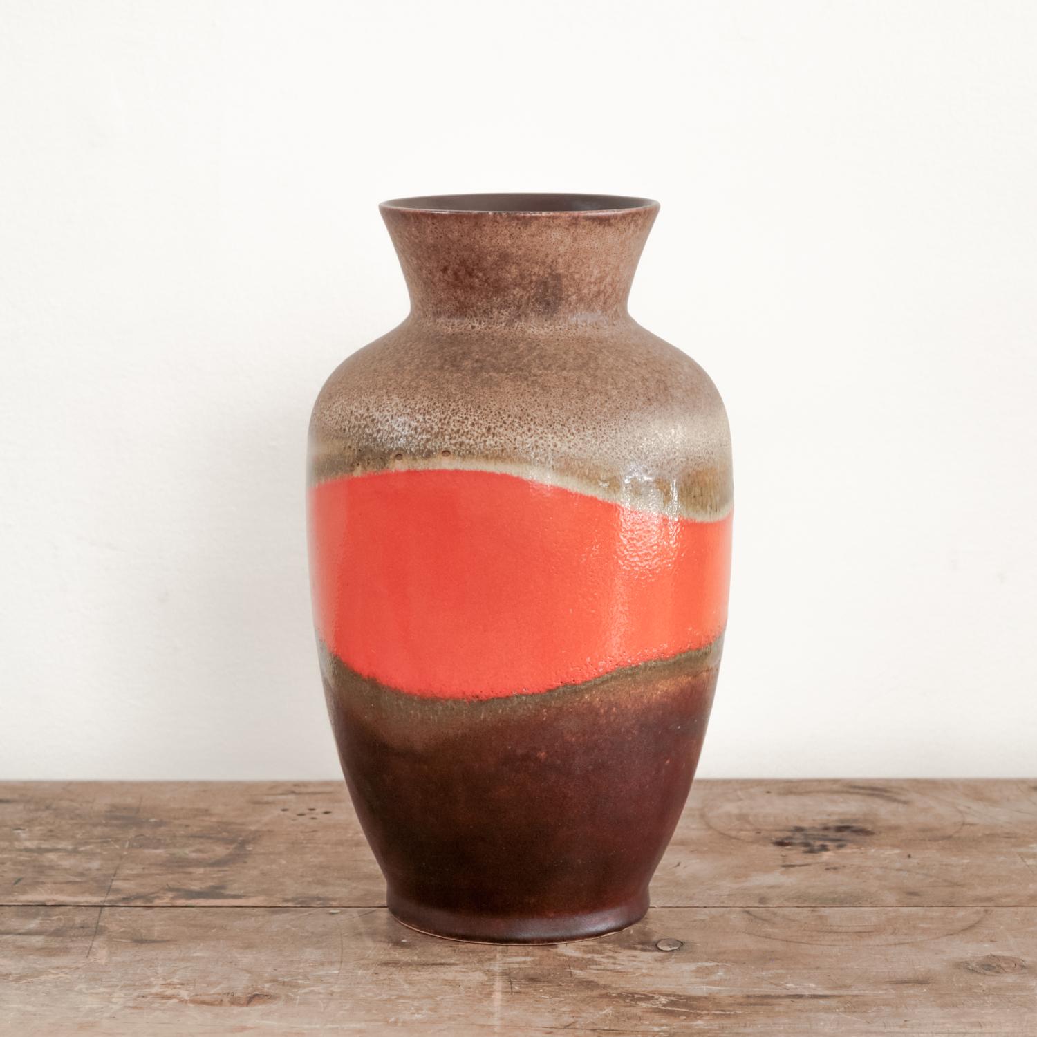 Ceramic vase with flared lip top and brown and orange glazing with banding detail, West Germany circa 1970's.